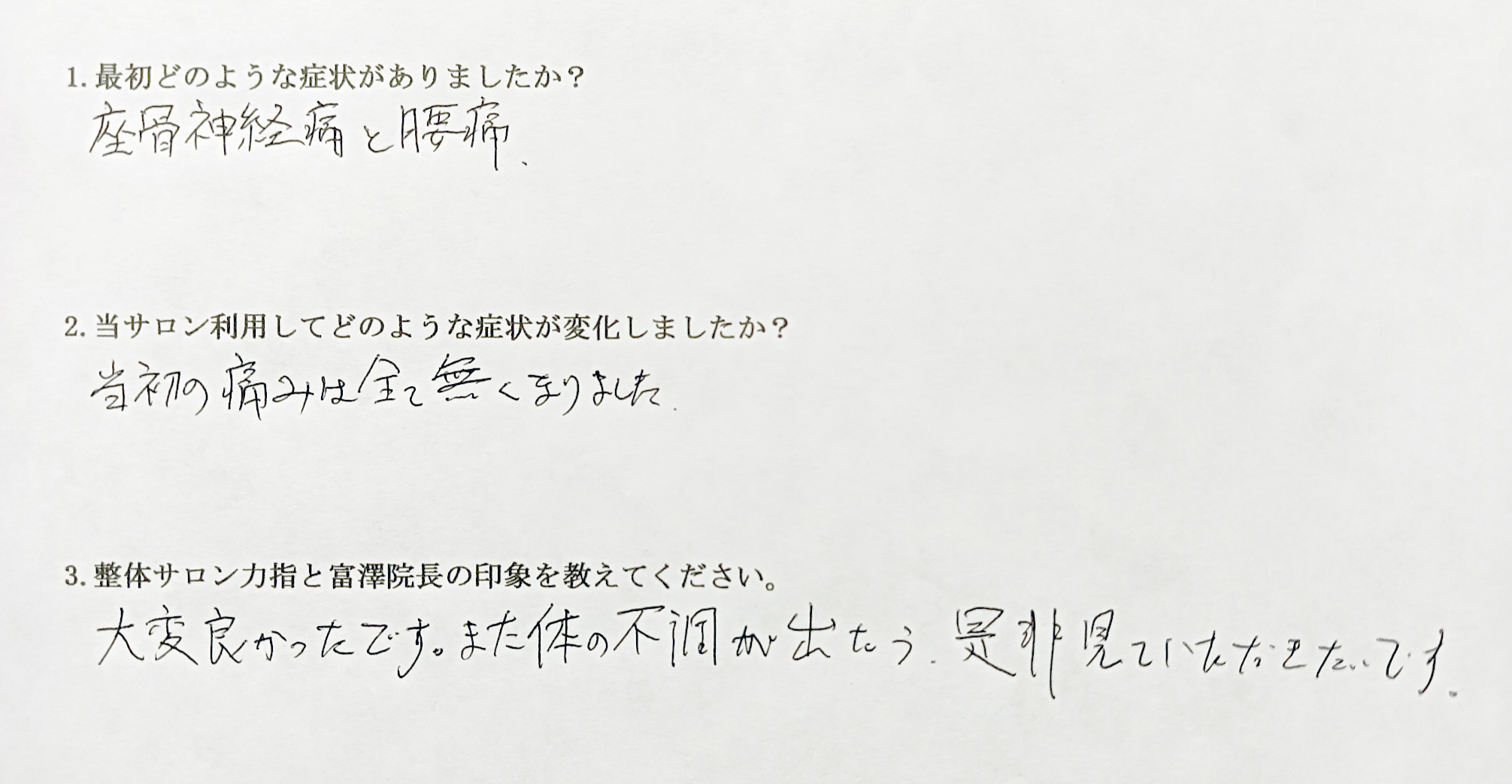 1.最初どのような症状がありましたか? 2.当サロンを利用してどのような症状が変化しましたか? 3.整体サロン力指と富澤院長の印象を教えてください。